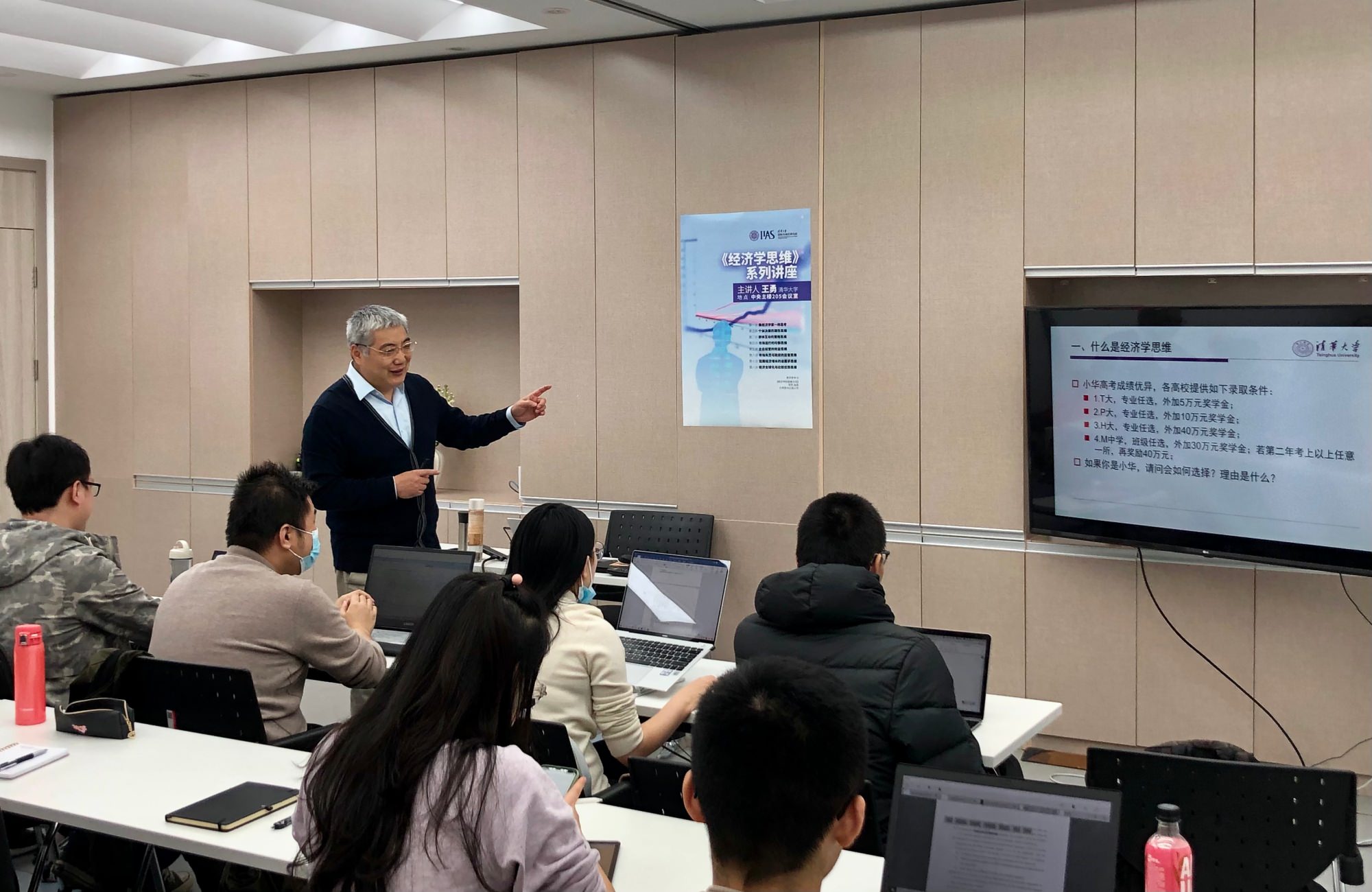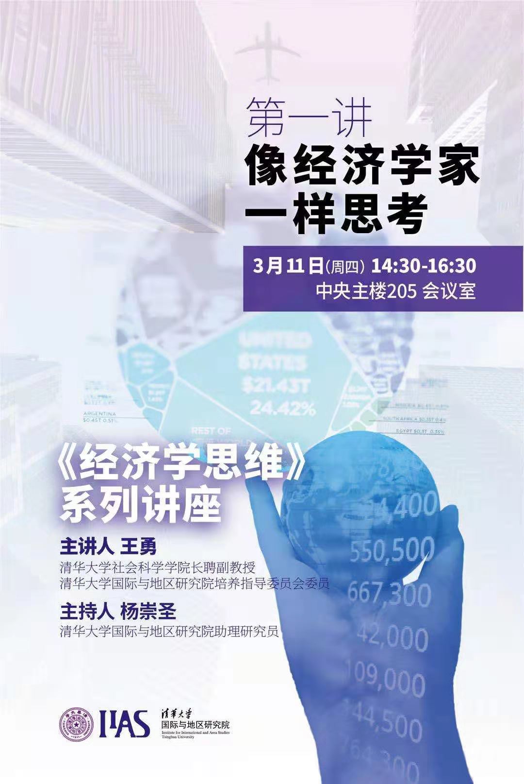 On the afternoon of March 11th, 2021, “The Economic Way of Thinking”, the first lecture series in the new semester of Institute for International and Area Studies, Tsinghua University (IIAS-THU), kicked off in Auditorium 205 of the Central Main Building, with the theme of “Think Like an Economist”. Prof. Wang Yong, Associate Professor of the School of Social Sciences, Tsinghua University, was invited as the keynote speaker in this series, aiming at providing necessary training of economic thinking for the lifelong growth of THU students to “cultivate the moral self, regulate the family, govern the state, then lead the world to peace”.