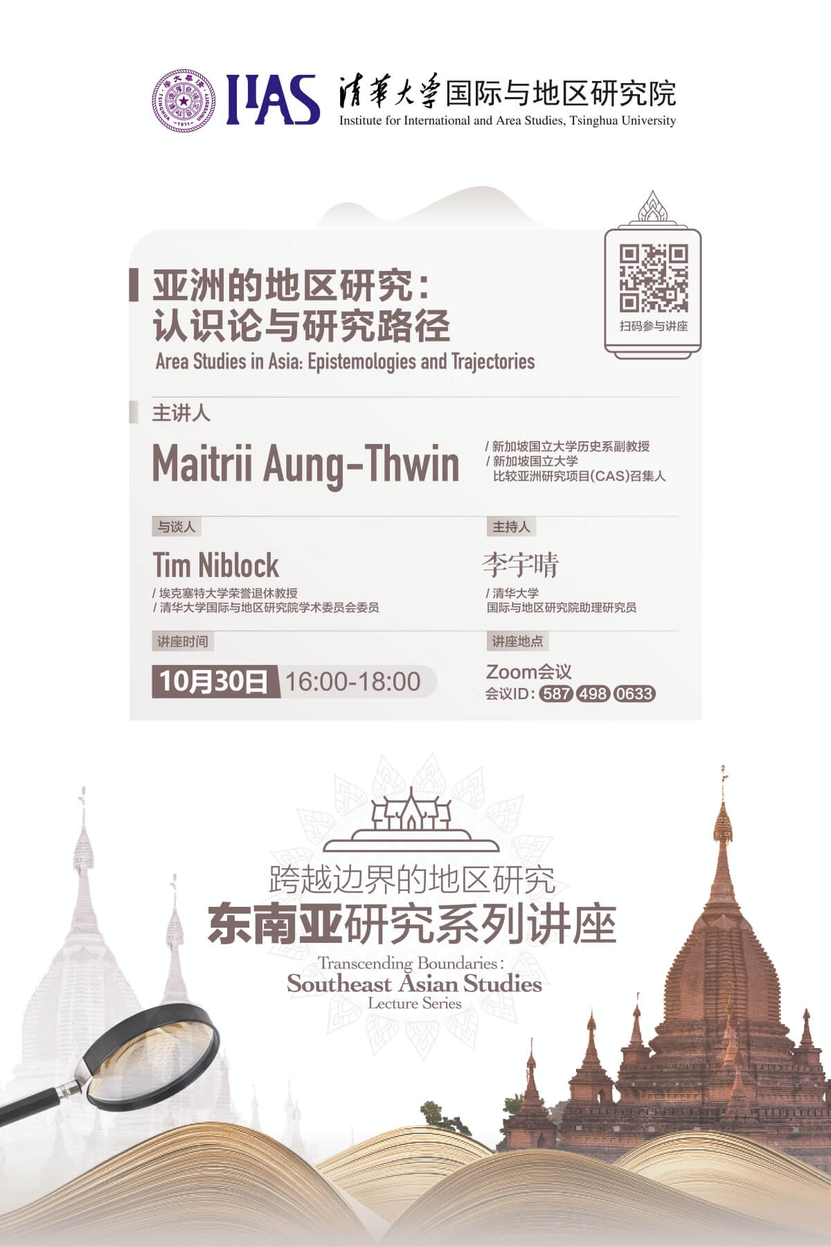 On the afternoon of October 30th, 2020, Prof. Maitrii Aung-Thwin, Associate Professor at the Department of History, National University of Singapore (NUS) and initiatior of the Comparative Asia Studies Program (CAS) at NUS, delivered an online lecture entitled “Area Studies in Asia Epistemologies and Trajectories” to more than 70 participants from inside and outside Institute of International and Area Studies, Tsinghua University (IIAS-THU). It is also the fourth session of “Area Studies Across the Boundaries: Southeast Asian Studies” hosted by IIAS.