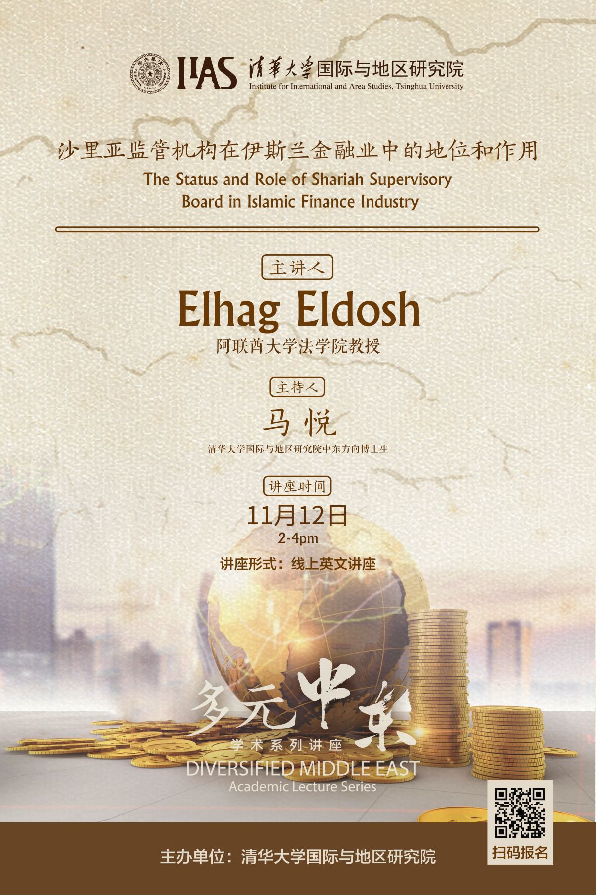 On the afternoon of November 12th, 2020, Prof. Elhag Eldosh, Professor at the College of Law of United Arab Emirates University, shared an online lecture on the theme “The Status and Role of Shariah Supervisory Board in Islamic Finance Industry” with doctorate candidates at Institute of International and Area Studies, Tsinghua University (IIAS-THU) and scholars from IIAS and beyond. This event is also the 6th session of IIAS’ “Pluralistic Middle East” Lecture Series. Ma Yue, PhD candidate in Middle East Law at IIAS, presided over the lecture.