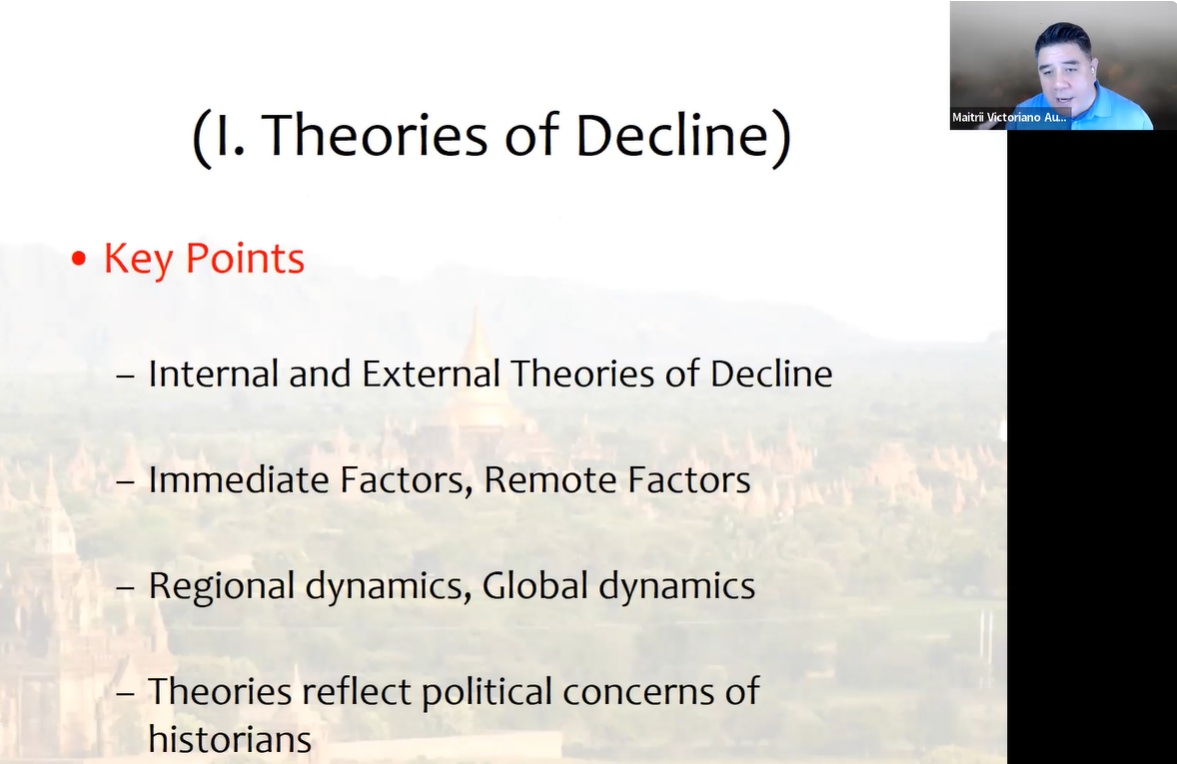 鉴于这些古代社会中宗教和王权的特殊关系,在讲座的后半部分,昂敦教授以缅甸蒲甘王朝为例,论述了东南亚古代宪章国家的衰落机制。这些国家在公元14至15世纪均出现了中央政权的衰弱、国家的碎片化、内部的动乱、文明的消亡等迹象。昂敦教授介绍了当前学术界对于东南亚古国衰落的几种原因解释。早期的欧洲殖民者提出了“衰竭论(Exhaustion)”,即国家内部资源衰竭使得其难以为继。然而,昂敦教授指出,这一论断是不够充分的。维克多·李伯曼(Victor Lieberman)提出了“君权外缘衰减(Princely Devolution)”的理论,指出曼荼罗式的东南亚古代权力结构中处于中央的君主权力逐渐下放削弱,从而导致了边缘政权的崛起和古代王国的碎裂化。迈克尔·昂敦(Michael Aung-Thwin)提出了“宗教资源衰减(Religious Devolution)”的理论,即世俗政权资助宗教机构的可征税土地和人力资源呈现出衰减的现象。这一论述指向了东南亚古国宗教信仰系统与世俗政经系统的结构性矛盾。在缅甸历史的发展进程论述中,迈克尔·昂敦与李伯曼之间还就缅甸历史是循环发展还是直线发展进行了争论。对于东南亚古国衰落现象的其他归因还包括:来自外部的竞争(如周边海洋贸易国的崛起)、蒙古入侵与人口流动、气候变化等。昂敦教授指出,在分析衰落原因时,应当对东南亚地区内部的动因予以关注,并注意不同理论提出时的历史和政治背景,从而做到对论证的科学评估和对历史更为包容的理解。