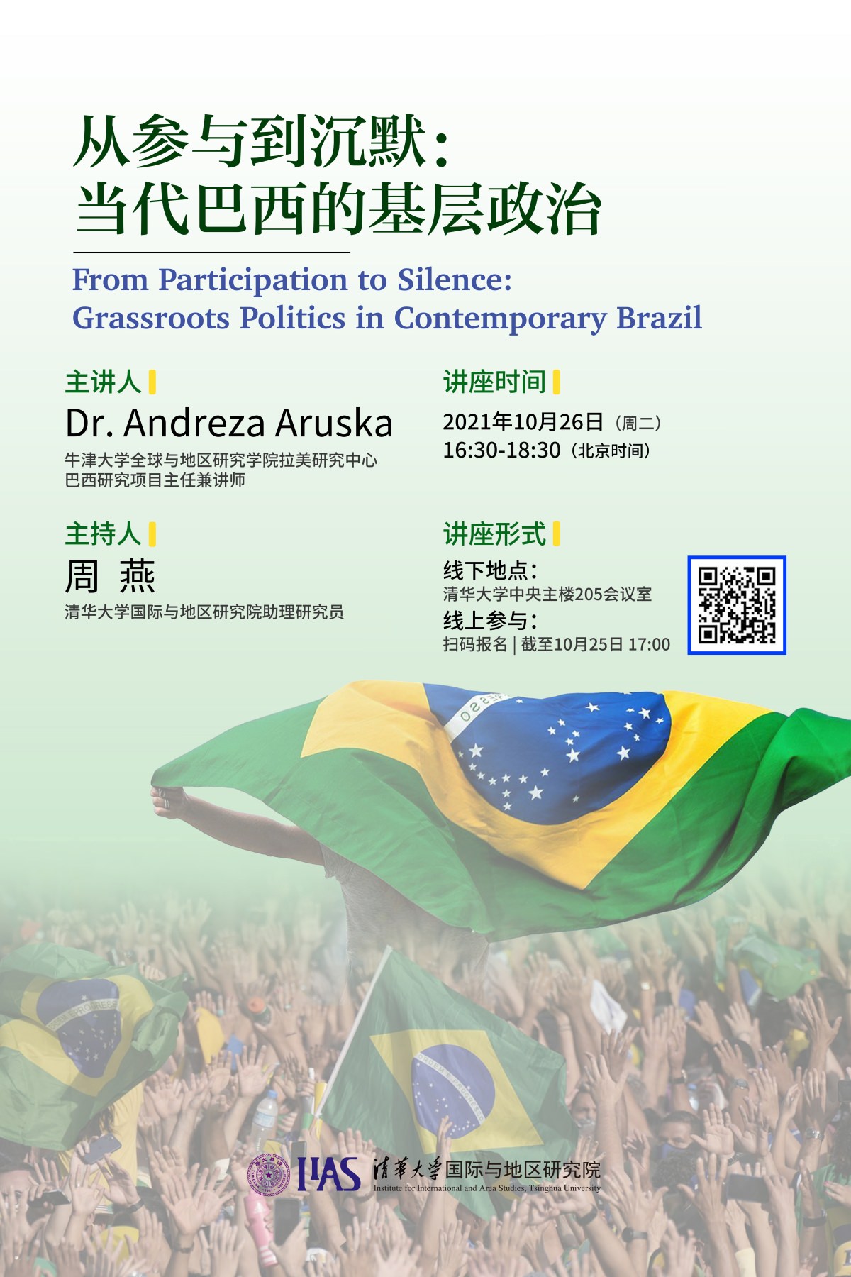 主办的2021年秋季学期第一场拉美和加勒比地区研究讲座顺利举办。本场讲座嘉宾是来自牛津大学的巴西研究项目主任Dr. Andreza Aruska,讲座围绕“从参与到沉默:当代巴西的基层政治(From Participation to Silence: Grassroots Politics in Contemporary Brazil)”的主题展开。本场讲座由草榴社区