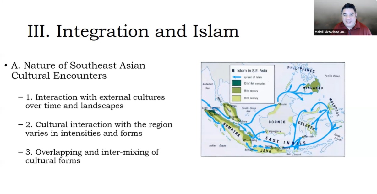 伊斯兰教的传播是15至18世纪海岛东南亚地区的一个重要历史进程。伊斯兰教伴随着穆斯林的海洋商贸从阿拉伯半岛经由南亚地区来到东南亚,马六甲和亚齐等港口城市首先接受了伊斯兰教。在其后的几个世纪中伊斯兰教逐渐从海岛地区向腹地传播。在早期的伊斯兰教传播中,苏菲派被广泛接受。一种可能的解释是,苏菲主义的舞蹈仪式与东南亚本土信仰的仪轨有着相似之处。昂敦教授指出,东南亚地区与外部文化的互动总是融合性、多元化和本土化的。伊斯兰教作为当时的先进观念,为东南亚本土带来了新的世界观,也使得本土社群能够吸引穆斯林商人定居,从而使东南亚参与到活跃的全球贸易之中。皈依伊斯兰教的马六甲王朝是是马来世界海洋贸易兴盛的代表。马六甲王朝由室利佛逝巨港城的王子创建,与明王朝维护了良好的关系。在和平与稳定的时期,马六甲吸引了各地船只顺着季风前来进行香料、胡椒、丝绸、茶叶等大宗商品的全球贸易。马六甲王朝崛起于海洋贸易,衰落于内部的权力斗争和外部新兴海权国家的竞争。马六甲王朝将伊斯兰教文化与马来文化的身份认同紧密关联,进一步融合和发展了东南亚的马来社会。