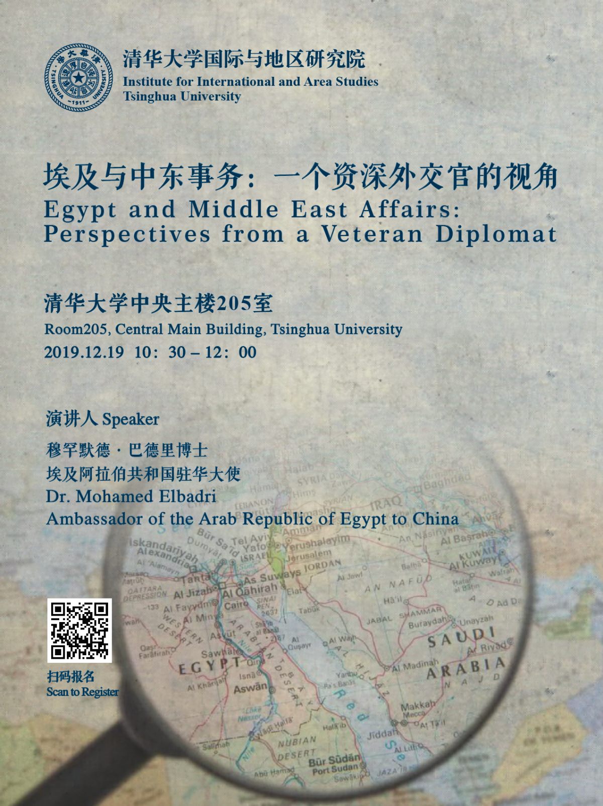 On December 19, 2019, Dr. Mohamed Badri, the current Egyptian Ambassador to China, gave a lecture entitled “Egypt and Middle East: The Perspective of a Senior Diplomat” at the Institute of International and Area Studies (IIAS) of Tsinghua University.