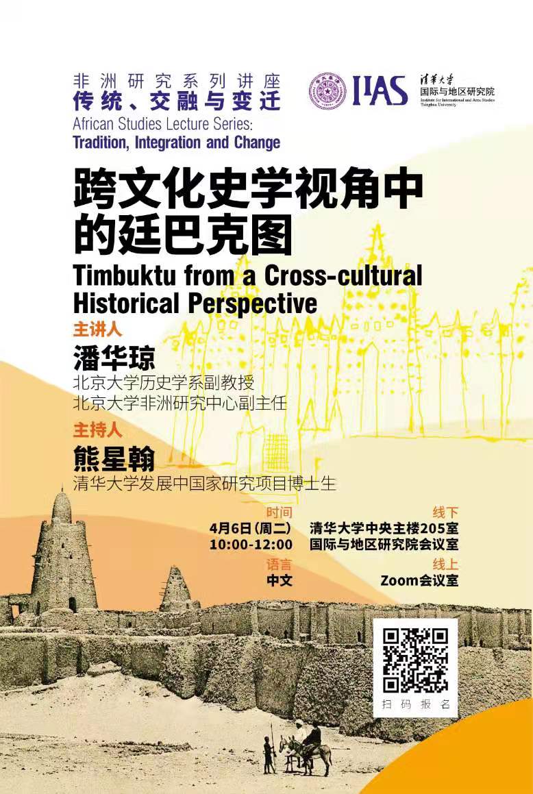 2021年4月6日上午,非洲研究系列讲座:传统、交融与变迁第一讲在中央主楼205会议室召开,主题为跨文化史学视角中的廷巴克图。本次讲座主讲人是北京大学历史学系副教授潘华琼,地区研究院博士生及研究员参加了现场的线下讲座,部分校外学生参加了线上讲座。