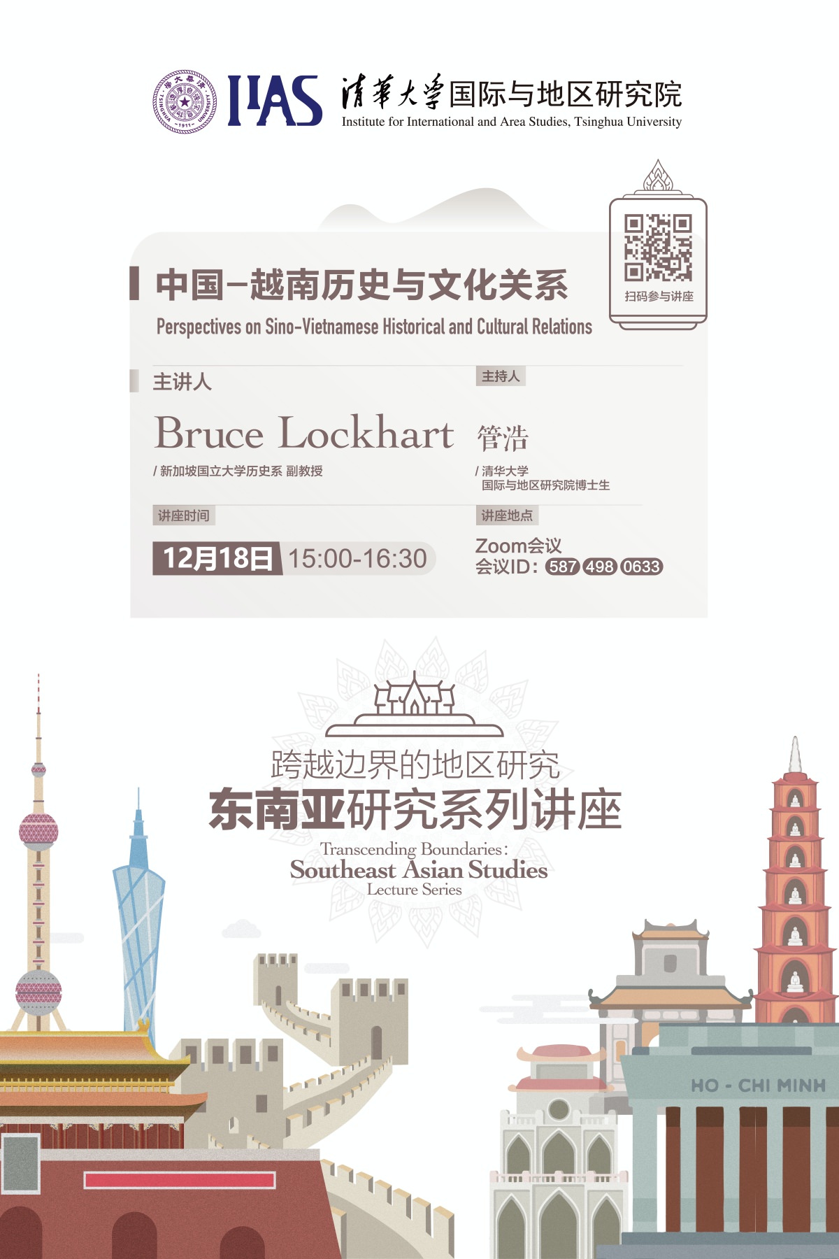“跨越边界的地区研究:东南亚研究系列讲座”迎来了最后一位嘉宾。来自新加坡国立大学历史系的罗恩光(Bruce Lockhart)副教授通过线上会议的方式为一百余名听众带来的题为“中国-越南历史与文化关系”(Perspectives on Sino-Vietnamese Historical and Cultural Relations)的精彩讲座。本讲的顺利举办也标志着本学期东南亚研究系列讲座的圆满结束。