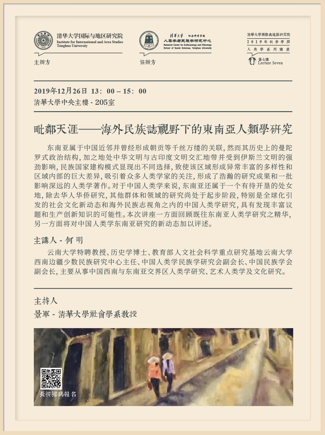 2019年秋季学期人类学系列讲座第7讲暨本系列最后一讲,由云南大学特聘教授何明老师主讲,讲座题目为《毗邻天涯——海外民族志视野下的东南亚人类学研究》。