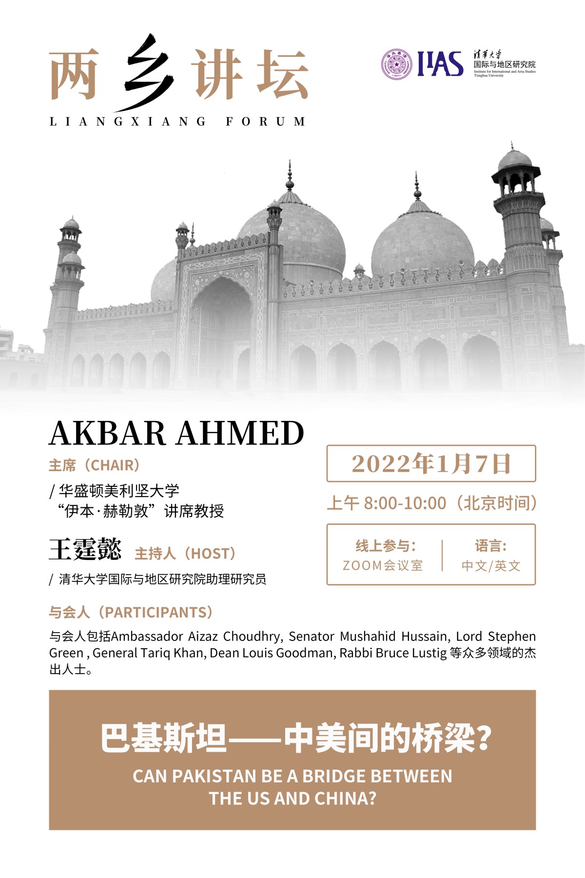 2021年秋季学期“两乡讲坛”第七讲通过线上形式召开,论坛主题为“巴基斯坦——中美间的桥梁?”。本场论坛由华盛顿美利坚大学“伊本·赫勒敦”讲席教授、巴基斯坦前驻英大使Akbar Ahmed担任主席,草榴社区