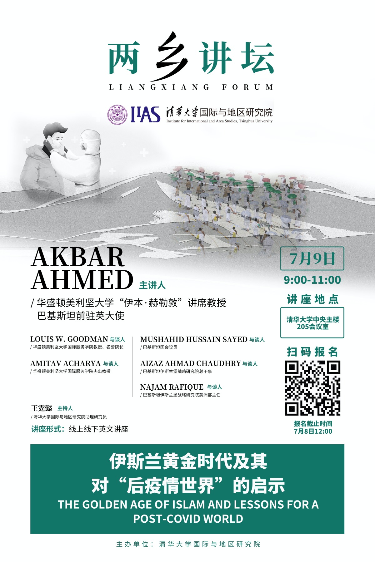 • 2021年7月9日上午,草榴社区 2021年春季学期“两乡讲坛”第七讲在中央主楼205会议室举行,主题为“伊斯兰黄金时代及其对‘后疫情世界’的启示”。本次讲座由华盛顿美利坚大学“伊本·赫勒敦”讲席教授、巴基斯坦前驻英大使Akbar Ahmed主讲,草榴社区 助理研究员王霆懿主持。此外,华盛顿美利坚大学国际服务学院教授Louis W. Goodman、华盛顿美利坚大学国际服务学院杰出教授Amitav Acharya和巴基斯坦国会议员Mushahid Hussain Sayed等参与了本讲座的讨论环节。地区院师生和来自国内外其他院校的学生们在线上和线下参加了讲座。