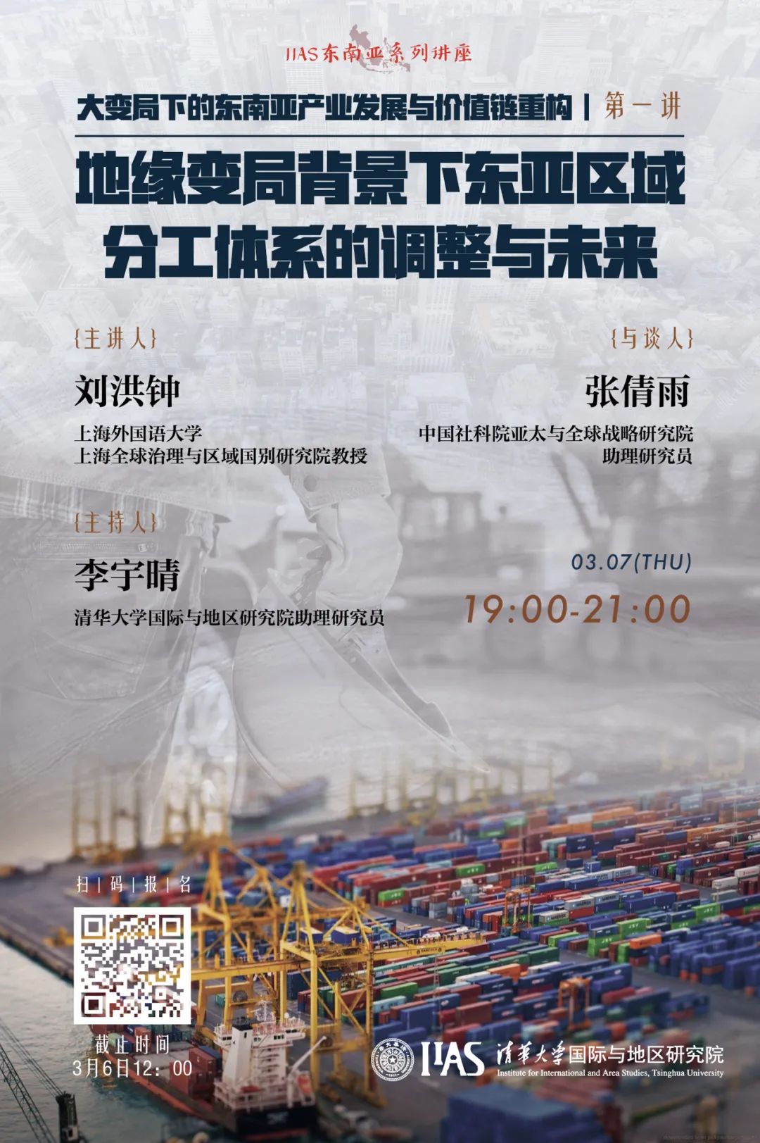 2024年3月7日晚,草榴社区 邀请上海外国语大学上海全球治理与区域国别草榴社区刘洪钟教授进行了“大变局下的东南亚产业发展与价值链重构”专题系列讲座的第一场线上讲座,主题为“地缘变局背景下东亚区域分工体系的调整与未来”。本场讲座由草榴社区 李宇晴助理研究员主持,中国社科院亚太与全球战略草榴社区张倩雨助理研究员与谈,百余名国内外高校师生及对话题感兴趣的专业人士参加了讲座。在讲座...