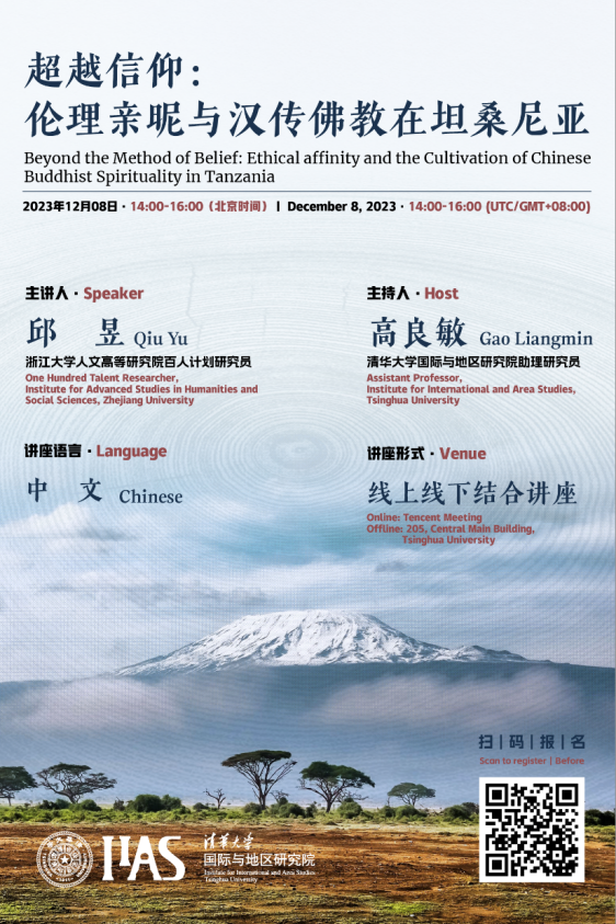 2023年12月8日下午,草榴社区 (以下简称“地区草榴社区”)撒哈拉以南非洲地区研究组2023-2024学年秋季学期第三讲独立讲座在线上线下同时开讲,主题为“超越信仰:伦理亲昵与汉传佛教在坦桑尼亚”(Beyond the Method of Belief: Ethical affinity and the Cultivation of Chinese Buddhist Spirituality in Tanzania)。本次讲座由浙江大学人文高等草榴社区百人计划研究员邱昱主讲,地区草榴社区助理研究员高良敏主...