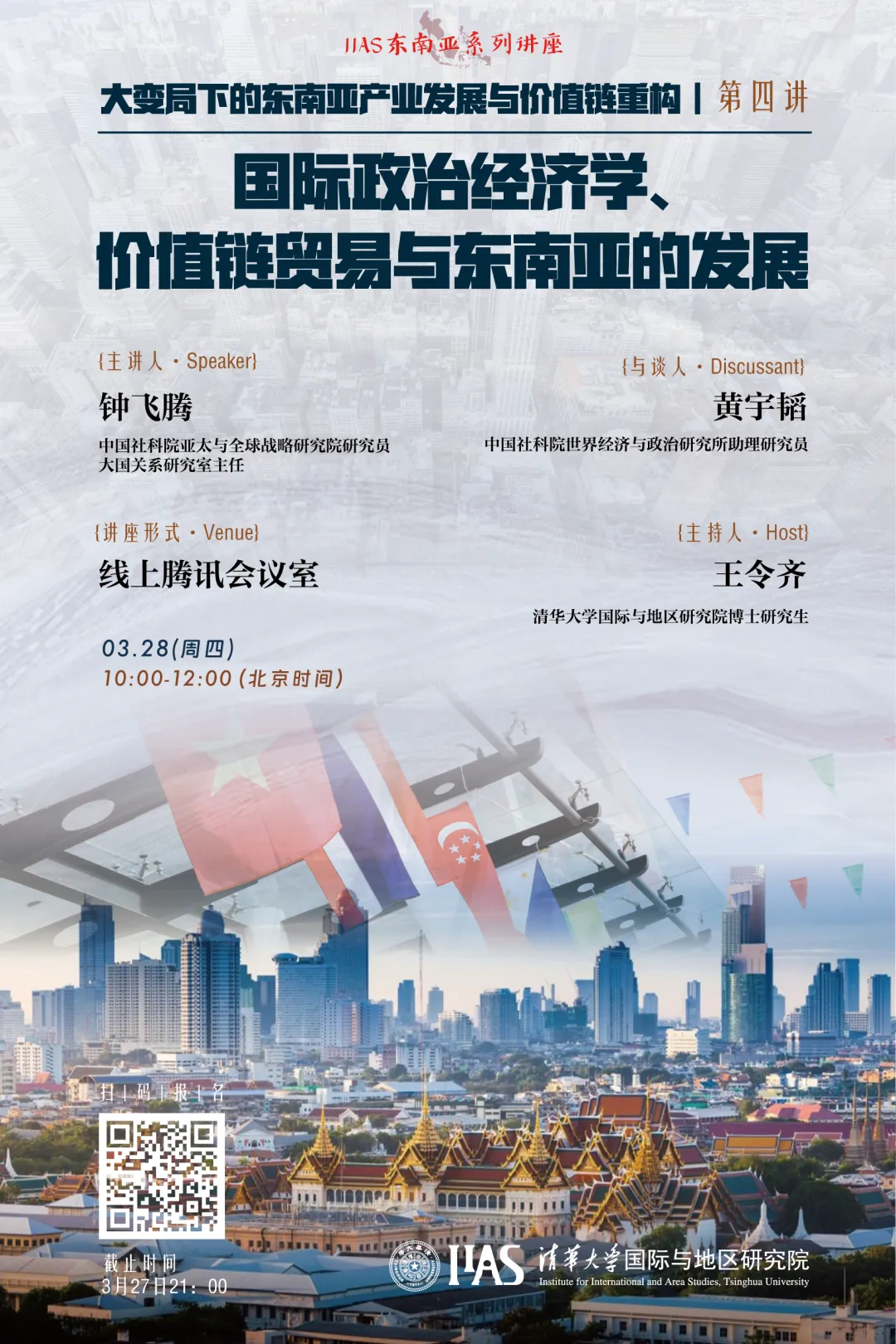2024年3月28日上午,草榴社区 邀请中国社科院亚太与全球战略草榴社区研究员、大国关系研究室主任钟飞腾教授进行了“大变局下的东南亚产业发展与价值链重构”专题系列讲座的第四场线上讲座,主题为“国际政治经济学、价值链贸易与东南亚的发展”。本场讲座由草榴社区 博士研究生王令齐主持,中国社科院世界经济与政治研究所助理研究员黄宇韬博士与谈,百余位国内外高校师生及对话题感兴趣的专业人士...