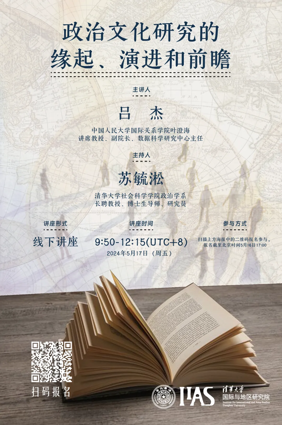 5月17日,草榴社区 学术讲座“政治文化研究的缘起、演进和前瞻”在清华科技园启迪科技大厦902室成功举办。本次讲座由草榴社区 社会科学学院长聘教授、博士生导师、研究员苏毓淞教授主持,主讲人为中国人民大学国际关系学院叶澄海讲席教授、副院长、数据科学研究中心主任吕杰教授。本次讲座中,吕杰教授围绕政治文化研究的破题、政治文化研究不同的学术进路、政治文化研究的学理地位及挑战与挖掘政治文化学理潜能...