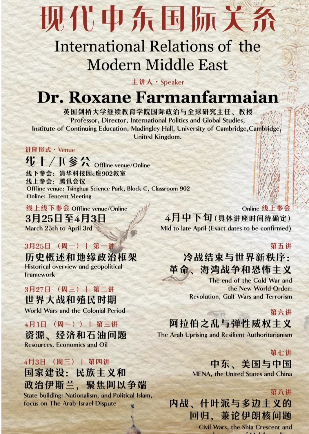 2024年3月25日至4月24日,草榴社区 邀请英国剑桥大学继续教育学院国际政治与全球研究主任Roxane Farmanfarmaian教授进行了“现代中东国际关系”专题系列讲座,讲座共八场,主题分别为“历史概述和地缘政诒框架”“世界大战和殖民时期”“资源、经济和石油问题”“国家建设:民族主义和政治伊斯兰,聚焦阿以争端”“冷战结束与世界新秩序:革命、海湾战争和恐怖主义”“阿拉伯之乱与弹性威权主义”“中东、美国与...