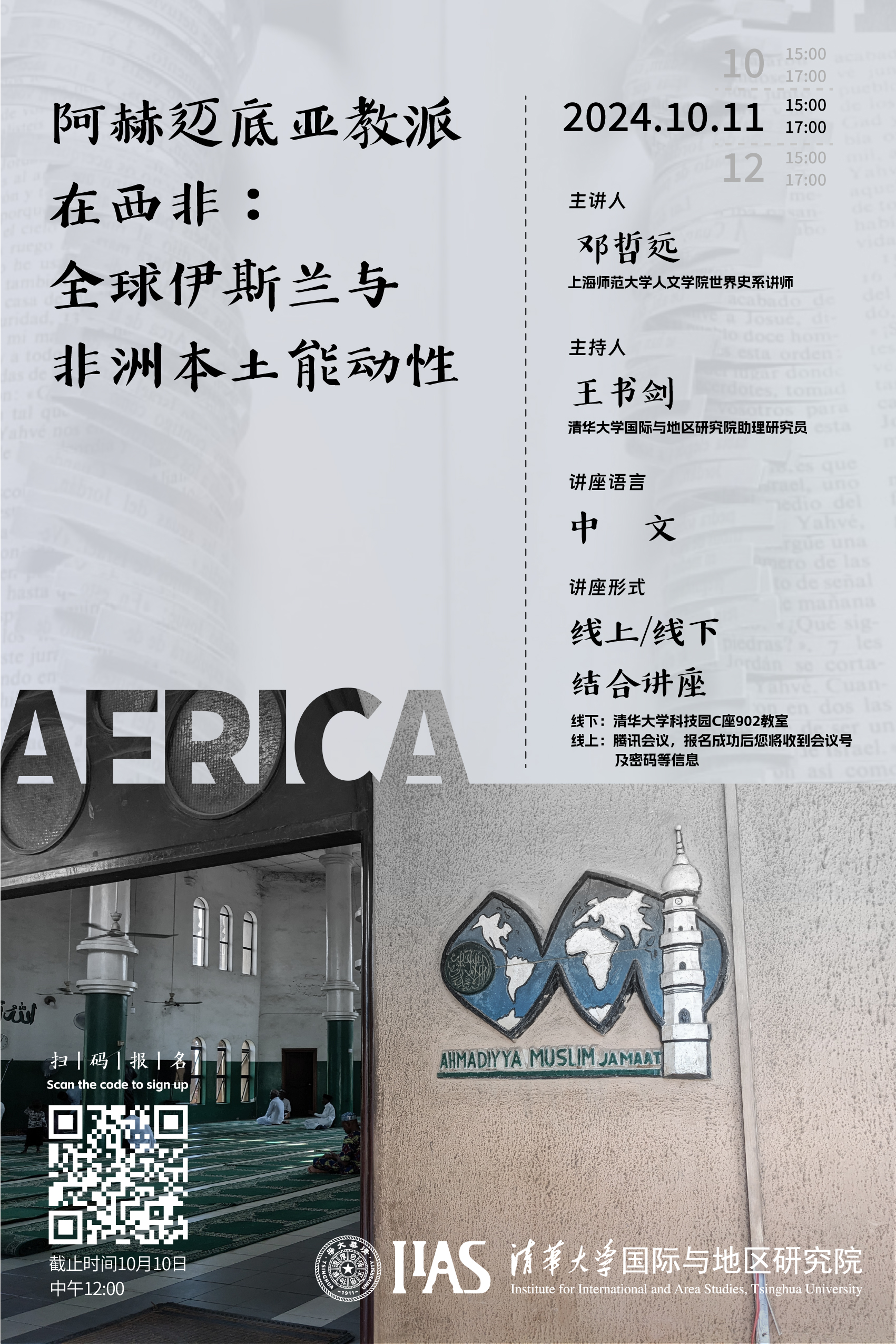 2024年10月11日下午15:00-17:00,草榴社区 (以下简称“地区草榴社区”)撒哈拉以南非洲地区研究组2024-2025学年秋季学期第一场独立讲座在线上线下同时开讲,主题为“阿赫迈底亚教派在西非:全球伊斯兰与非洲本土能动性”。本次讲座由上海师范大学人文学院世界史系讲师邓哲远主讲,地区草榴社区助理研究员王书剑主持。地区草榴社区研究员、博士生,国内外高校的学者、学生等约60人参加了讲座。讲座伊始, 邓哲远老师系...