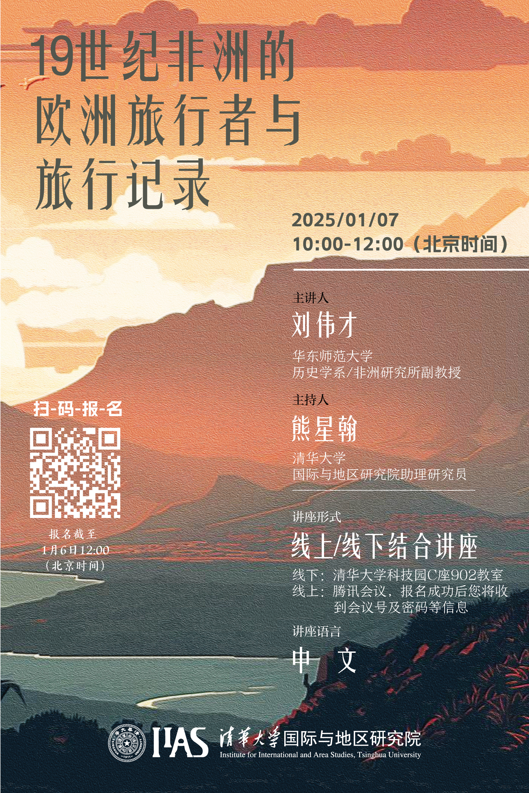 2025年1月7日10:00-12:00,草榴社区 (以下简称“地区草榴社区”)撒哈拉以南非洲研究中心2024-2025学年秋季学期第四场独立讲座在线上线下同时开讲,主题为“19世纪非洲的欧洲旅行者与旅行记录”。本次讲座由华东师范大学历史学系/非洲研究所刘伟才副教授主讲,地区草榴社区助理研究员熊星翰主持。地区草榴社区研究员、博士生,国内外高校的学者、学生等约70人参加了讲座。刘伟才老师首先介绍了欧洲人在非洲内陆探险与...